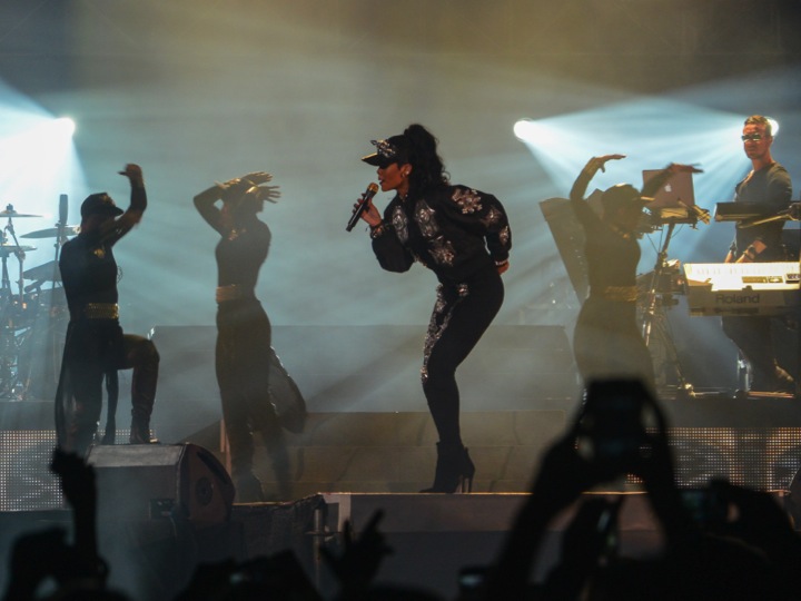 She appeared on a high rise stage, sporting a silver diamond cap and “diamond” encrusted black jacket with leggings. Her outfit was a throwback to Janet Jackson’s Rhythm Nation outfit which came across to us as a respectable gesture to the Pop icon. The packed stadium erupted as she yelled “Johannesburg are you ready to party with me tonight?” kicking off her first track “Fresh of the runway”