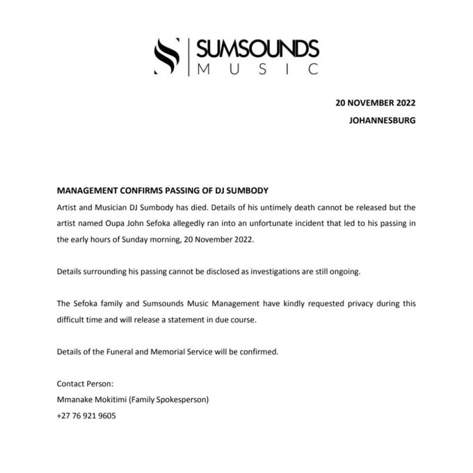 According to the statement, an investigation is currently underway following his untimely passing. The Sefoka family and Sumsounds Music Management request privacy during this difficult time.