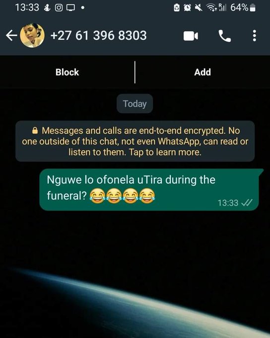 "Phatha makhandlela 2 amhlophe nomnikelo ka 200 uze sixasulule simo sakho ngokhlala se mdumezulu sgodi etshehlophe ngungaka nakala sukuma" Twitter Screenshot Twitter Screenshot Tweeps are having a field day at DJ Tira's expense following the mystery call being ignored. One of the reason he could not answer was because he was still during the funeral. However, the other reason is that he is seated next to his wife, Gugu Khathi.