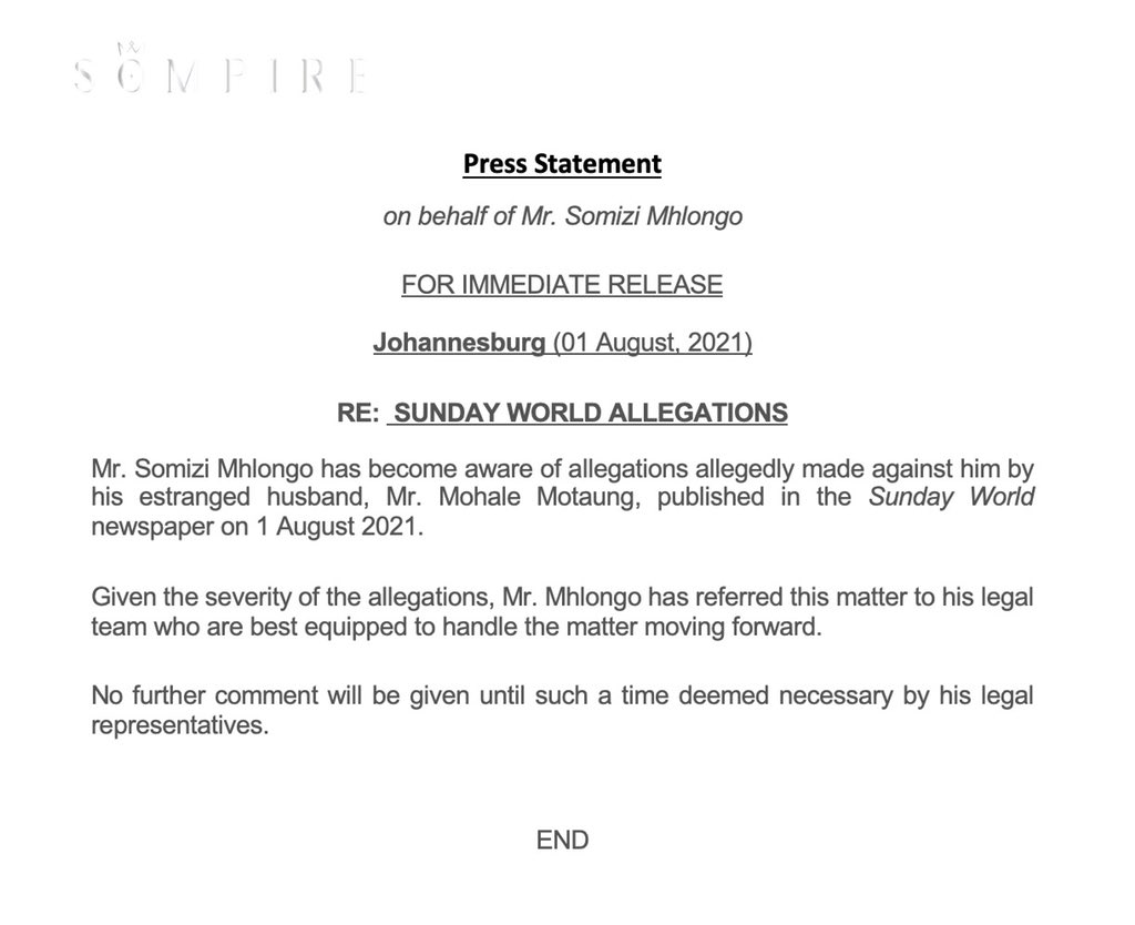 Following yesterday's published article, Somizi, through his legal team, issued a statement and said they are looking into it. So could he have laid charges against Mohale?Somizi's statement Image credit: Twitter A few days ago, Mohale subbed the media and how they publish false rumours by laughing at a tweet which made such accusations. But these allegations came from the horses mouth.