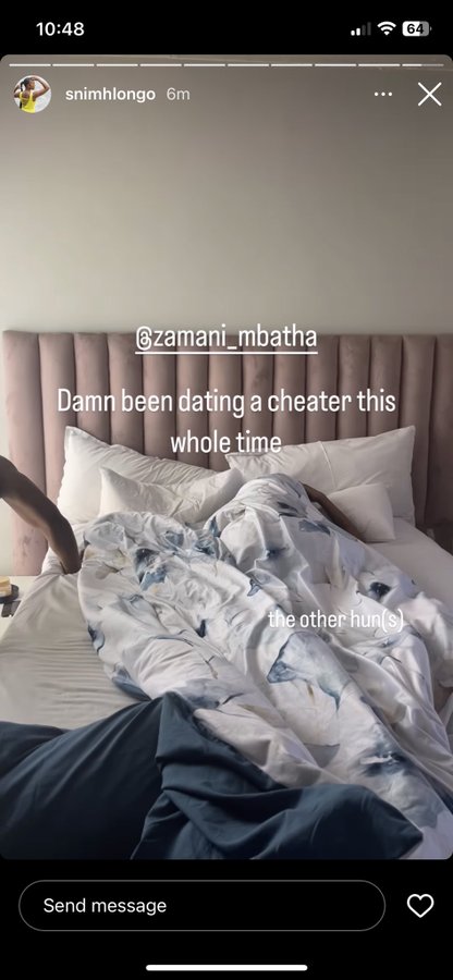 "Snimhlongo accuses her boyfriend Zamani Mbatha of cheating on her after finding her in bed with another girl ." wrote Sanele Nkosi