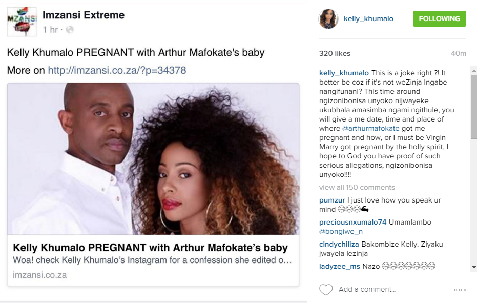 But Kelly had no idea, and was left disgusted by the story: “This time around ngizonibonisa unyoko nijwayele ukubhala amasimba ngami ngithule (this time around I'm gonna show you, your mother, you're used to writing sh** about me and I keep quiet), you will give a me date, time and place of where @arthurmafokate got me pregnant and how, or I must be Virgin Marry got pregnant by the holy spirit, I hope to God you have proof of such serious allegations, ngizonibonisa unyoko!!!! (I will show you, your mother).”