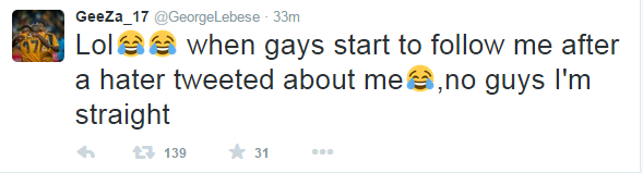 George Lebese has rubbished those gay rumours. The football player found himself trending on social media after a Twitter user, @_KaraboNYC, alleged that he's gay.