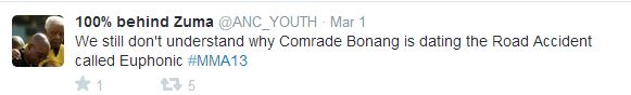 Let’s not kid ourselves the awards looked like an ANC rally, it just seemed as though there were more government officials than the actual musicians. The ANC Youth League twitter account was also on its worst behaviour that night taking jabs at award winners like Euphonik and Ifani.