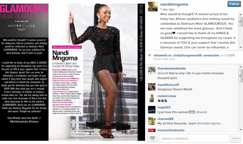 Nandi also thanked the magazine for her award. Well done, Nandi!