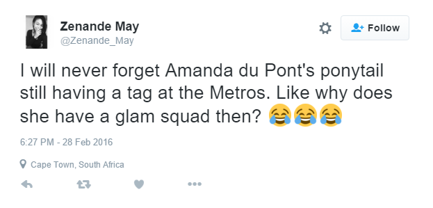 When Amanda walked on stage to present an award at #MMA15, her ponytail bounced from left to right, revealing a white price tag.