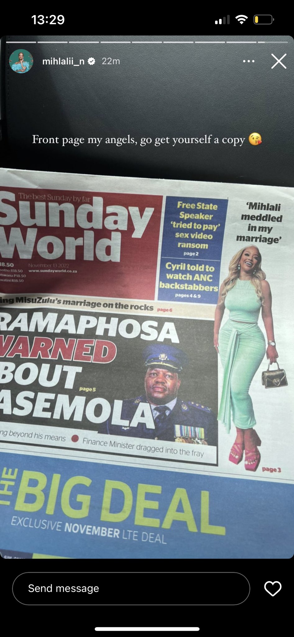 "Front page my angels, go get yourself a copy" wrote Mihlali Ndamase