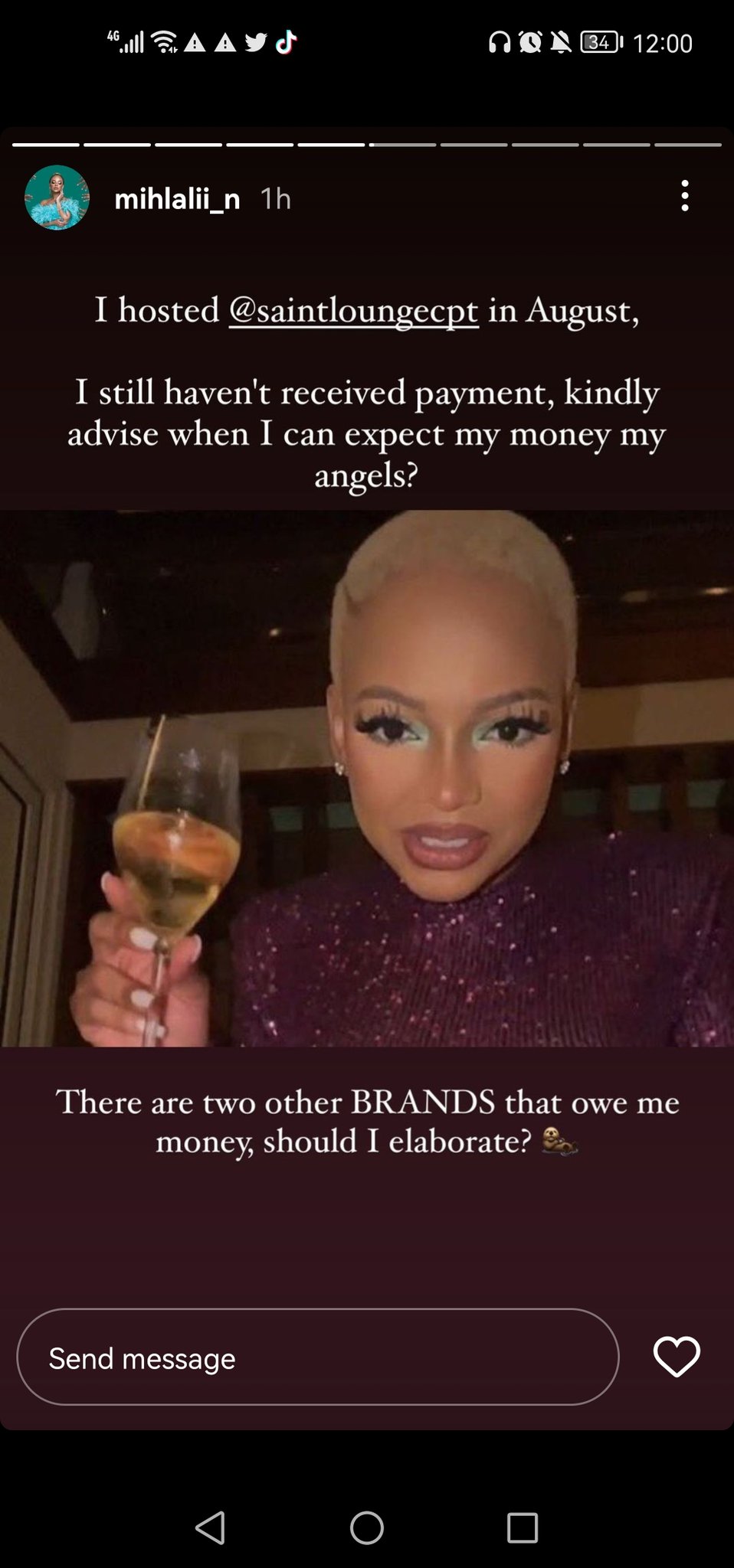 "I hosted @saintloungercpt in August, I still haven't received payment, kindly advise when I can expect my money my angels? These are two other brands that owe me mone, should I elaborate" wrote Mihlali Ndamase Mihlali Ndamase - IG Story "@vodacom, as much as I love you I didn't leave my house and shoot content for free, when are you paying me sana? wrote Mihlali Ndamase Mihlali Ndamase - IG Story "Hayike sana onths of not paying me as a brand ambassador @malfyginsa @roth_media" wrote Mihlali Ndamase Mihlali Ndamase - IG Story In closing, she said with her whole chast that she is not going to be the bigger person anymore, as she demands her money.
