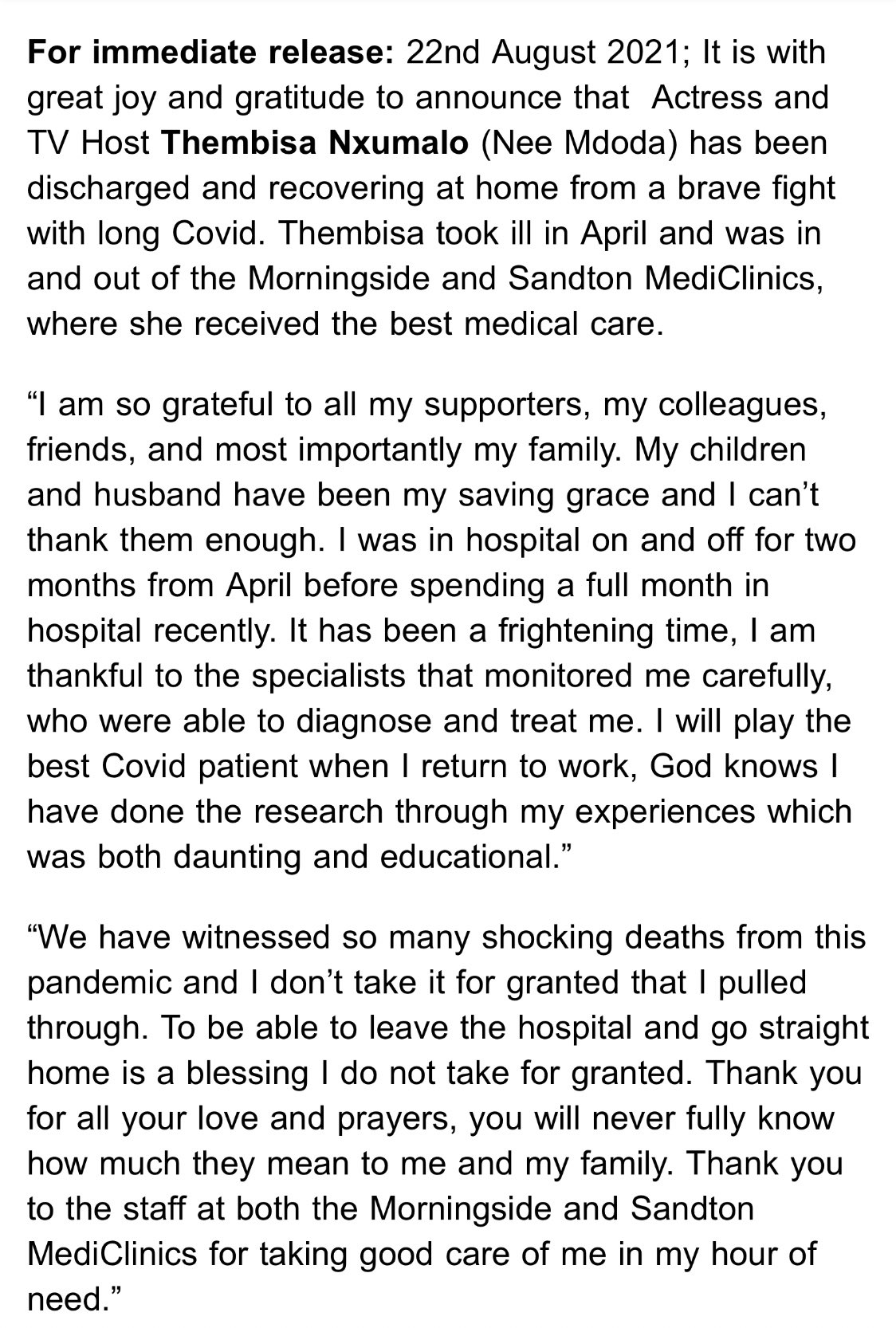 “The Mdoda family would like to thank all of you for all the calls and the messages concerning our beloved daughter Thembisa Nxumalo (Nee Mdoda) following a tweet regarding her health. She is indeed hospitalized and receiving the best medical treatment at Sandton MediClinic. She was diagnosed with long Covid-19 which was further aggravated by an allergy. We are fortunate the doctors diagnosed her in time and are treating her with the utmost care.”